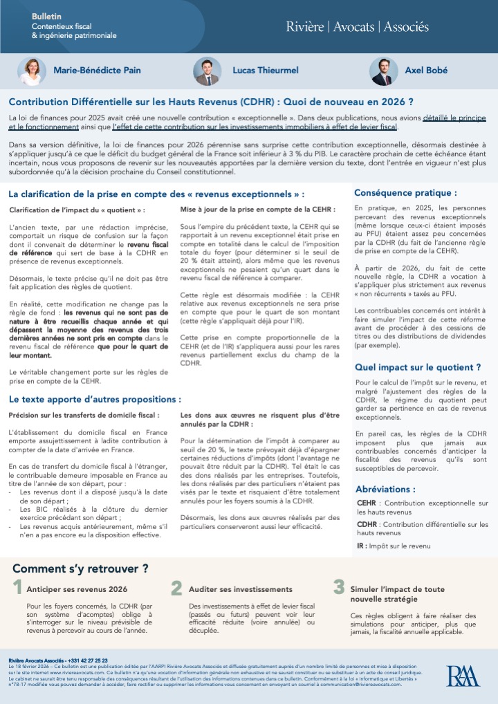 À partir de 2026, du fait de cette nouvelle règle, la CDHR a vocation à s’appliquer plus strictement aux revenus « non récurrents » taxés au PFU.
